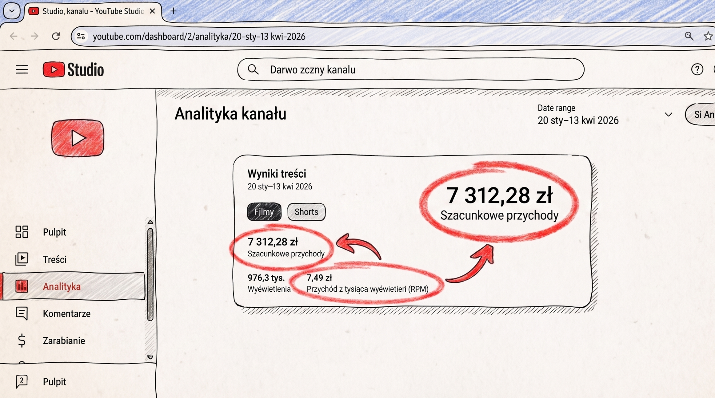 Zacznijmy od faktów. Poniżej screen z mojego YouTube Studio za okres od włączenia monetyzacji (20 stycznia) do 7 kwietnia 2026.