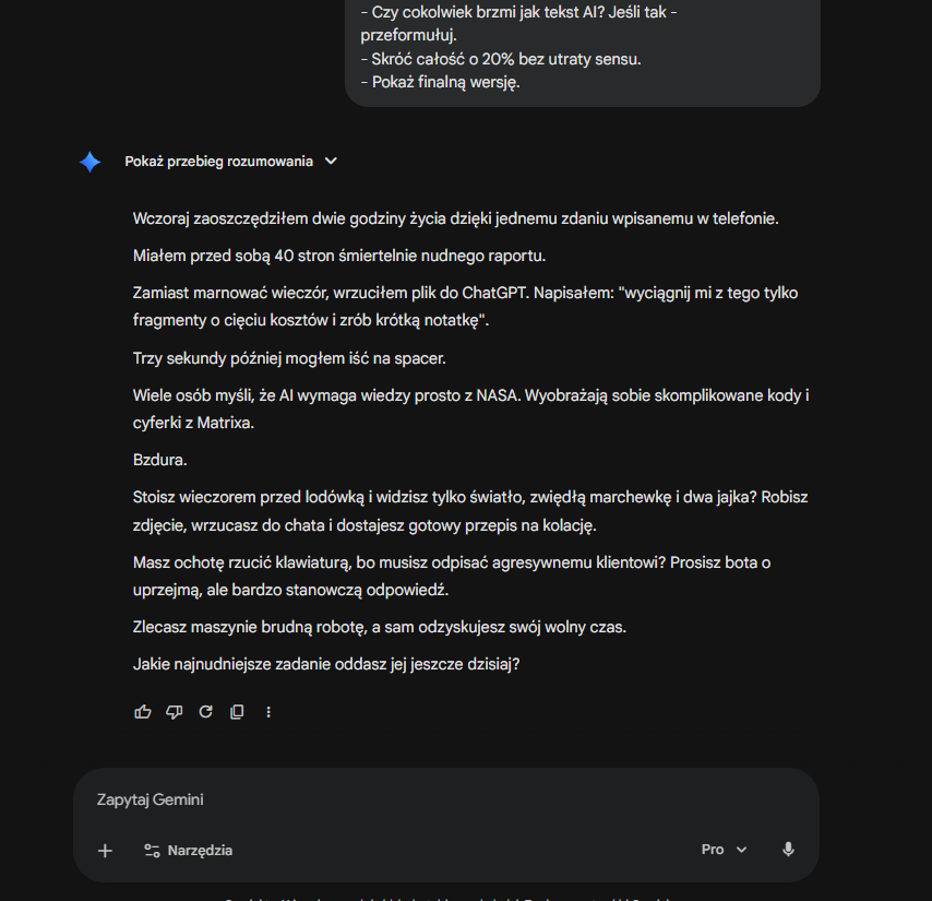 - Czy cokolwiek brzmi jak tekst AI? Jeśli tak - przeformułuj.